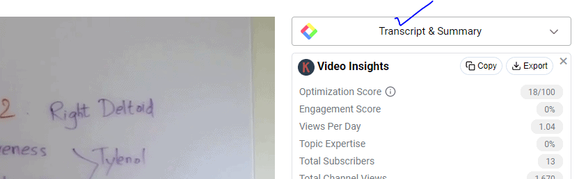 On upper right corner of the screen, you can see the Transcript and Summary [blue checkmark below] of the video made by Glasp that we downloaded above.